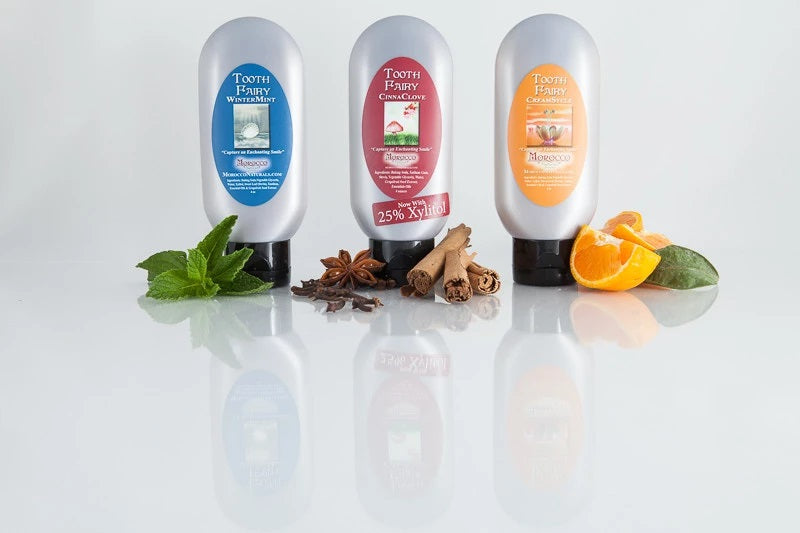 Baking Soda, Xanthum Gum, Stevia, 25% Xylitol, Fresh Spring Water, Vegetable Glycerin, Grape Seed Extract, (Wintergreen Oil, Spearmint Oil, Peppermint Oil, Lemon Oil) (Orange Oil, Tangerine Oil, Lemon Oil, Peppermint Oil) (Cinnamon Oil, Clove Oil, Peppermint Oil, Lemon Oil)